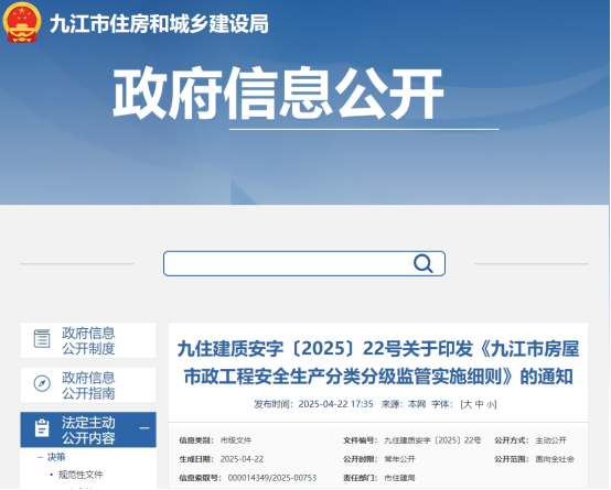 为优化监管模式,提升监管效能,日前,市住建局印发《九江市房屋市政工程安全生产分类分级监管实施细则》(以下简称《细则》),对全市房屋建筑和市政基础设施工程项目安全生产实施分类分级监督管理。